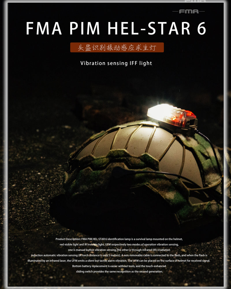 FMA PIM HEL-STAR 6 TB1434は、軍隊、法執行機関、捜索救助隊員に信号と識別機能を提供するために設計された、タクティカルヘルメットマウントライトです。現場での状況認識とコミュニケーションを強化するための、コンパクトで多用途なソリューションを提供します。