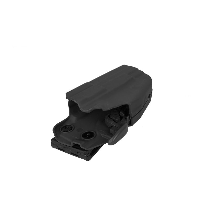 TMCユニバーサルスタンダードガンホルスターは、様々な銃にフィットするように設計されています。ほとんどの銃器にしっかりとフィットするよう調整可能です。ホルスターには革新的な技術が採用されており、ホルスターに収納すると自動的に銃が固定され、標準的なシューティンググリップで中指をかけると解除されるため、より直感的で安全なリリースが可能です。ホルスター本体は軽量で最先端のナイロン混紡素材を使用し、銃の表面を全く摩耗させず、極端な高温・低温にも耐え、メンテナンスも容易です。ベルトクリップはベルトから簡単に取り外し可能で、最大5cm幅のベルトにフィットします。