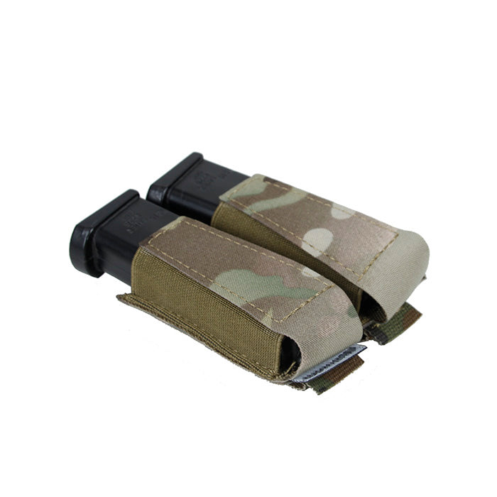 The Cork Gear Elastic Double Pistol Mag Pouch is a versatile, user-friendly open-top, collapsible magazine pouch. The nylon laminate and thick elastic material allow for a smooth draw, positive retention and easy reinsertion. MOLLE and belt compatible pouch will fit most double-stacked pistol magazines.