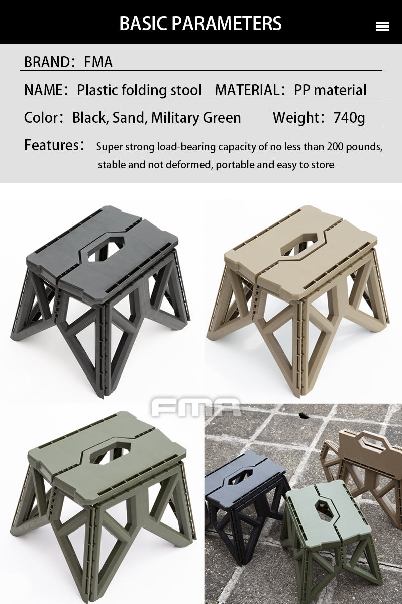 Overall, the FMA Camping Portable Plastic Stool TB1460 combines portability, durability, and comfort, providing a practical seating option for outdoor enthusiasts and travelers.
