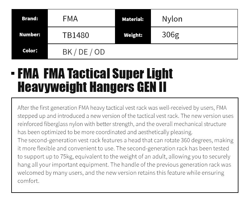 With its super lightweight, extremely high load capacity, multi-functional hooks, and durable construction, FMA Tactical Super Light Heavyweight Hangers GEN II TB1480 is undoubtedly an excellent choice for the equipment of military and law enforcement personnel. It not only provides safe and reliable support for your critical equipment, but also greatly reduces the user's burden and enhances mobility, making it an indispensable tactical accessory.
