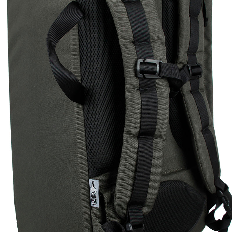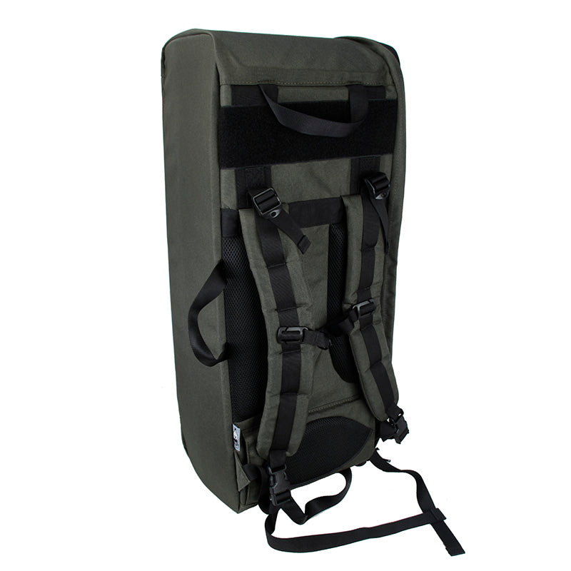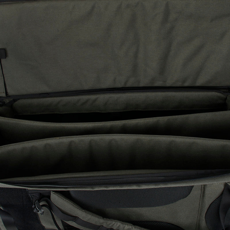 The Black Ships 75CM Moving Castle Deployment Pack Compact Version was derived with the intention of giving an informed user the ability to carry the most essential pieces of equipment in the most manageable, mobile and low signature profile as possible. This unassuming bag is formed with the likeness of a hockey goaltender bag meant to carry oblong leg pads, bulky chest protector, blocker, glove and helmet. The compact version only has single storage for all the gears with two hook and loop insert to manage guns and gears. This bag is meant to look inconspicuous even to individuals who are familiar with typical military or tactical gear. The first impression should be a hockey bag, snowboard pack, lacrosse kit or mountaineering travel duffle. The Black Ships 75CM Moving Castle Deployment Pack Compact Version replaces the cumbersome pair into an easy to carry, hands free and less threatening package. This bag contains a padded tubular main compartment indented to snugly retain and protect a modern equipped armor carrier, helmet, belt kit, footwear, and combative uniform. The body shape is designed to be easy to pack and access items while not giving unnecessary movement or orientation of items when transporting. The fully padded body housing reduces bump and damage to equipment while also minimizing printing of any contained items. The curved lines of the body lends itself to a more outdoor soft look instead of a hard edge, MOLLE strangled and Velcro covered military type bag. Hidden and balanced into the profile of the bag is a lockable rifle case. This section of the bag has generous closed cell foam padding to protect the contents and give no protrusion of any features to the concealed items. This pack is designed to stand upright when packed correctly to fit into commuter situations or allow you to stand in line at the ticket counter with ease. Ideal for a firearms class, airsoft weekend or always be prepared trunk. Weapons Compartment has internally anchored grommet points giving the user options to cable lock and secure the rifle, as well as a physical lock in place concept, to reduce the chance of your bag walking away. The top of the bag has 2 grommets to allow a cable lock to extend from the inside of the bag and secure to an anchor point when at a location to stop theft of the entire bag. Zipper closures allow for wide array of devices. 4 Cable grommets connect from the main compartment into the weapons compartment to add another layer of security from an attempt to add another layer of security from an attempt to access the contents of the weapons case. Multiple rigging methods and the ability to place a hard case into the weapons compartment make it an ideal airline bag.