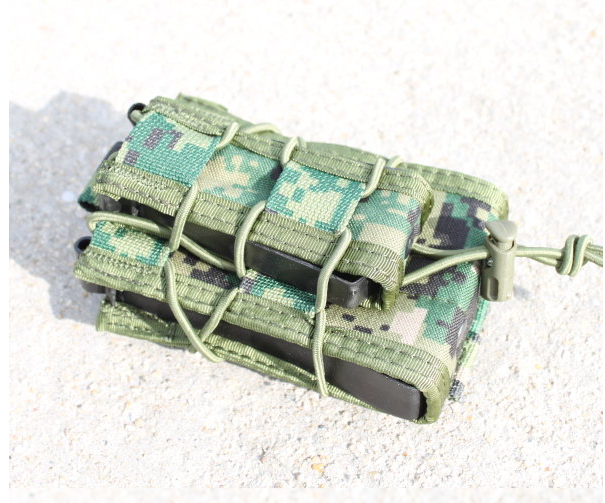 The Double Decker Tactical Assault Combination Mag Pouch their modular rifle mag pouch and a modular pistol mag pouch into one unit that can securely hold an infinite combination of mags and other accessories. Both pouches are made of Cordura, an injection molded polymer and shock-cord. The pouches both maintain a positive, adjustable grip of the mag and do not require any other securing systems unless desired.